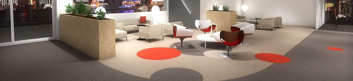 Напольные покрытия влияют не только на эргономическое, но и на визуальное самочувствие людей в помещениях. Уложенные на больших или малых площадях, они являются важной конструктивной особенностью архитектуры помещения и в равной мере с другими элементами определяют эстетику помещения. Швейцарский производитель текстильных напольных покрытий Fabromont в свое время придумал идею формирования сферических агломератов из смесей штапельных волокон путем специального механического воздействия. Запатентованная смесь различных полимеров в материале под названием Kugelgarn делает его прочным, износостойким и устойчивым к порезам. При этом листы материала можно легко обрезать до любой формы. Это позволяет комбинировать различные цвета и формы, укладывать материал в соответствии с любым дизайном интерьера и использовать его для расстановки индивидуальных визуальных акцентов или выполнения функциональных задач, таких как разметка зон или проходов . После укладки швы незаметны.