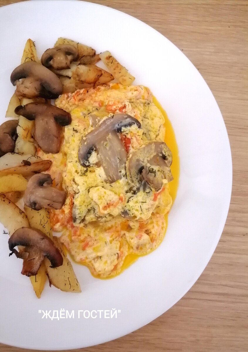 Сегодня будем готовить очень вкусное блюдо из минтая в сливочном соусе с шампиньонами. Можно взять целую рыбу и нарезать кусочками, а можно использовать готовое филе, как вам больше нравится. Для соуса лучше взять 20% сливки, добавим обжаренные шампиньоны и морковь. В этом соусе рыбка получается очень вкусной. Это блюдо можно подать как самостоятельное, а можно приготовить гарнир. Ингредиенты: 1. Минтай 4 кусочка 2. Шампиньоны 150-200 грамм 3. Сливки 20% 200 мл. 4. Морковь 1 штука 5. Мука 5 ст. ложки 6. Масло растительное 7. Перец чёрный молотый по вкусу 8. Соль по вкусу 9. Укроп сушёный 10. Картофель для гарнира Приготовление: Шампиньоны нарезать пластинками. Обжарить шампиньоны на растительном масле. Морковь помыть, почистить и натереть на крупной тёрке. Обжарить морковь на растительном масле. Минтай можно взять кусочками или филе. Заранее разморозить в холодильнике. Рыбу слегка посолить и поперчить. В глубокую тарелку насыпать муку. Рыбу со всех сторон обволять в му
