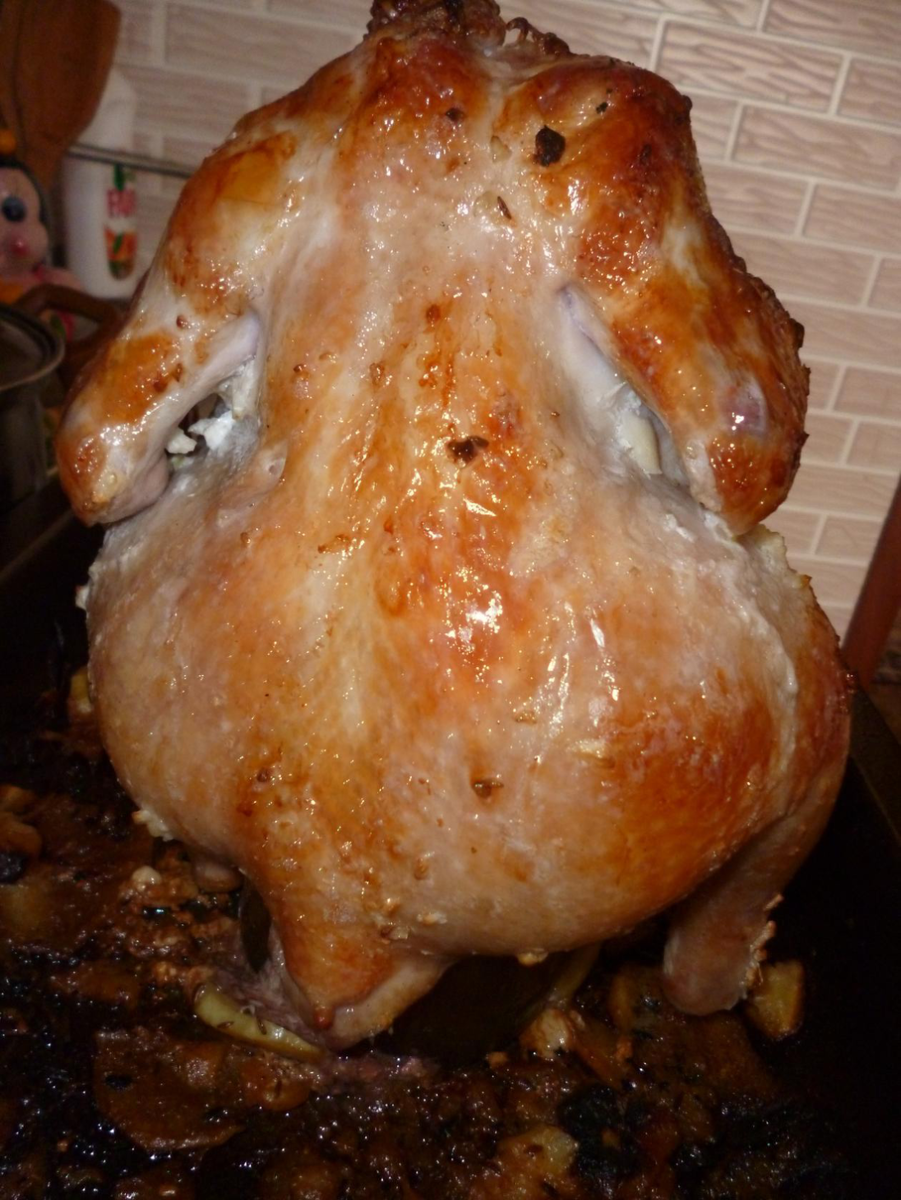 Сделать массу для обмазывания – смешать сметану с раздавленным чесноком, солью и перцем. Обмазать этой смесью курицу со всех сторон, в том числе под крылышками и ножками. Когда курица начнет запекаться, с нее будет капать жир и сок на противень. Чтобы жир не подгорал, в противень надо налить примерно 1-1-5 см. воды. Больше не надо, иначе от поднимающегося снизу пара курица будет не столько запекаться, сколько тушиться.