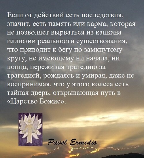 Идеи начинают воссоздавать новые идеи внутри себя до бесконечности, таким образом, осуществляя иллюзию бесконечности существования мира. Творцы рождаются в творце и продолжают выстраивать бесконечную цепь, не имеющую окончания. Цепи – скованные эго, невозможно разорвать никакими способами, никакими самоутверждениями или добродетелями, цепи так и останутся цепями. Вся разница только в составе этих цепей, сделанных из металла или золота, имея смысл накопления негативной или позитивной кармы или, другими словами: не важно из каких поступков состоит наша жизнь, любые из них приводят к последствиям. Если от действий есть последствия, значит, есть память или карма, которая не позволяет вырваться из капкана иллюзии реальности существования, что приводит к бегу по замкнутому кругу, не имеющему ни начала, ни конца, переживая трагедию за трагедией, рождаясь и умирая, даже не воспринимая, что у этого колеса есть тайная дверь, открывающая путь в «Царство Божие». Эту дверь возможно открыть исключит