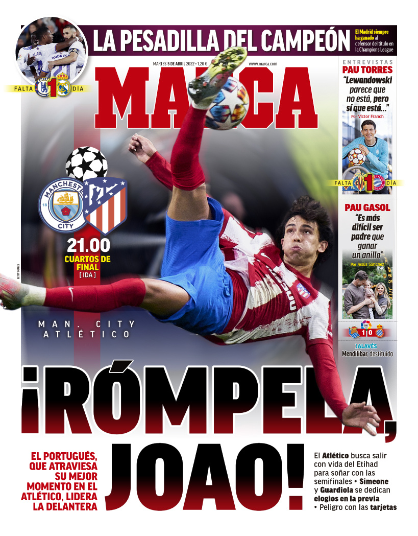 «Сломай их, Жоао!» «Атлетико» возвращается в Манчестер через три недели после победы над «Юнайтед», чтобы встретиться с «Сити» Гвардиолы, одной из лучших команд Европы. 22-летний португалец, красующийся сегодня на обложке, переживает свой лучший период в «Атлетико», соответственно является одной из главных надежд мадридцев в этом противостоянии. Самое время для Жоао доказать всем, что 120 млн на его покупку были потрачены не зря. Стартующая сегодня дуэль в Манчестере, несомненно является одной из самых интригующих пар стадии 1/4 ЛЧ. Игра, которую два самых одержимых парня в футболе рисовали в своих головах неделями, выходит далеко за рамки стилей. Два лучших тренера в истории футбола стремятся к титулу, о котором давно мечтают. #лига чемпионов #ман сити #атлетико мадрид #жоау феликс