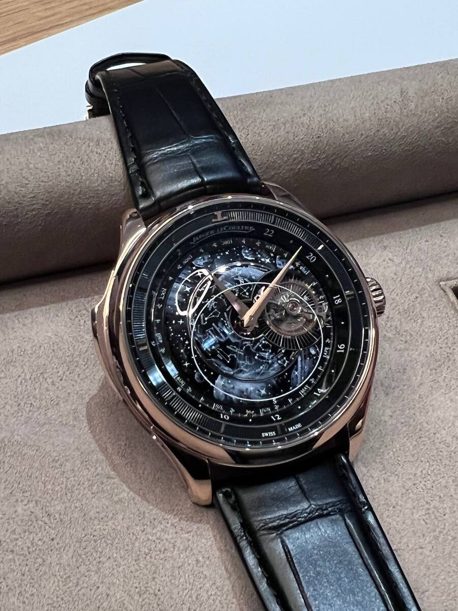 Следующая новинки JLC – Master Hybris Artistica. Часы представлены в корпусе из белого или розового золота. Обе версии будут выпущены всего лишь в количестве пяти экземпляров. Цена – свыше 400 000 евро. В основе сложнейший мануфактурный калибр Calibre 945, имеющий такие усложнения, как индикация лунного календаря, уравнение времени, минутный репетир и парящий турбийон. Уравнение времени – это функция, демонстрирующая текущую разницу между реальным солнечным и средним местным временем. На самом деле сутки, если быть точным, длятся 23 часа 56 минут и 4,1 секунды. И новинка показывает время корректное по планетам (и даже из положение) и наше земное искаженное.