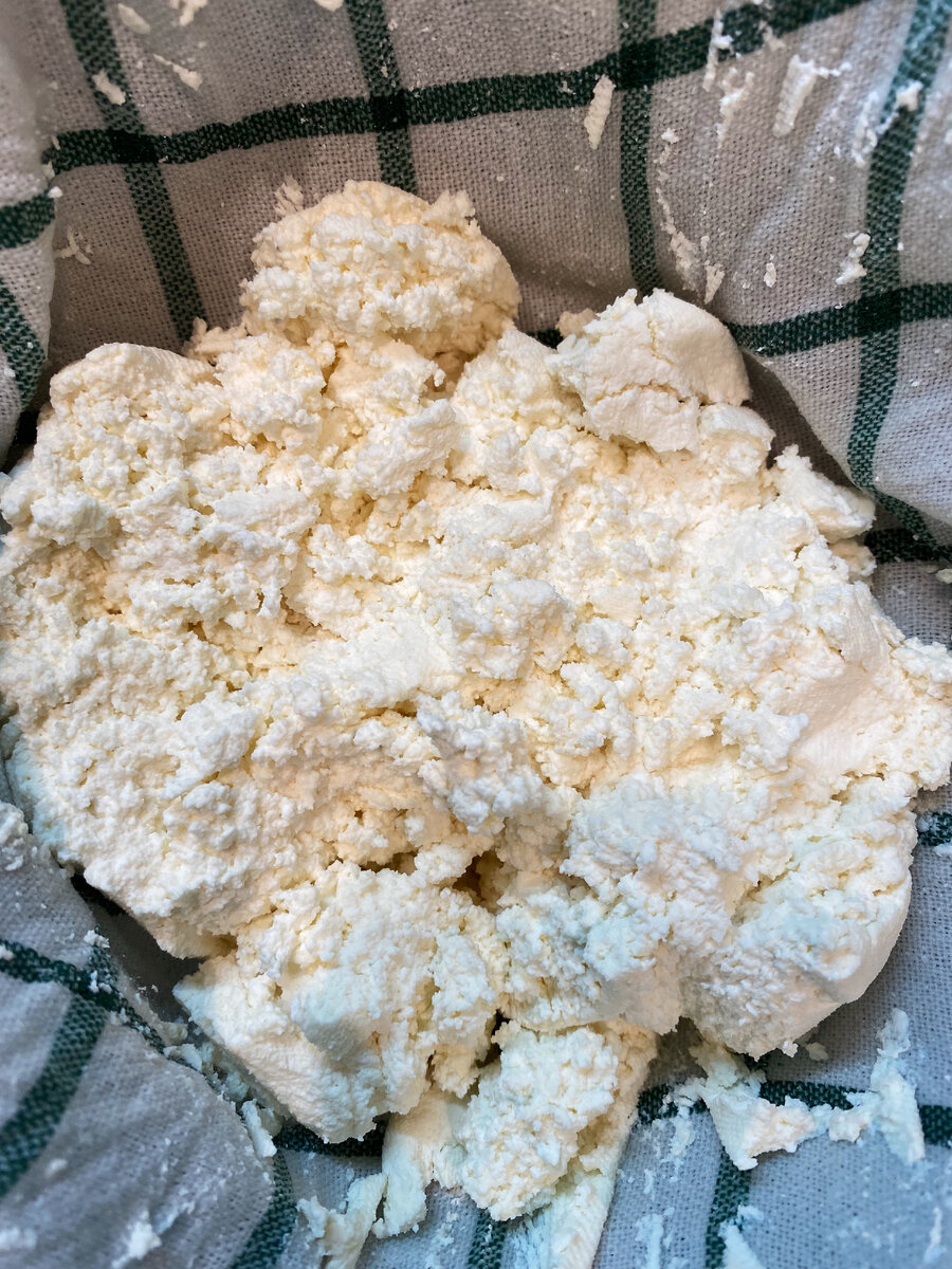 Затем откинуть все содержимое на дуршлаг с марлей или полотенцем и дать стечь сыворотке. Чем больше, в конечном итоге, отжать сыворотки от творога, тем суше он получится.