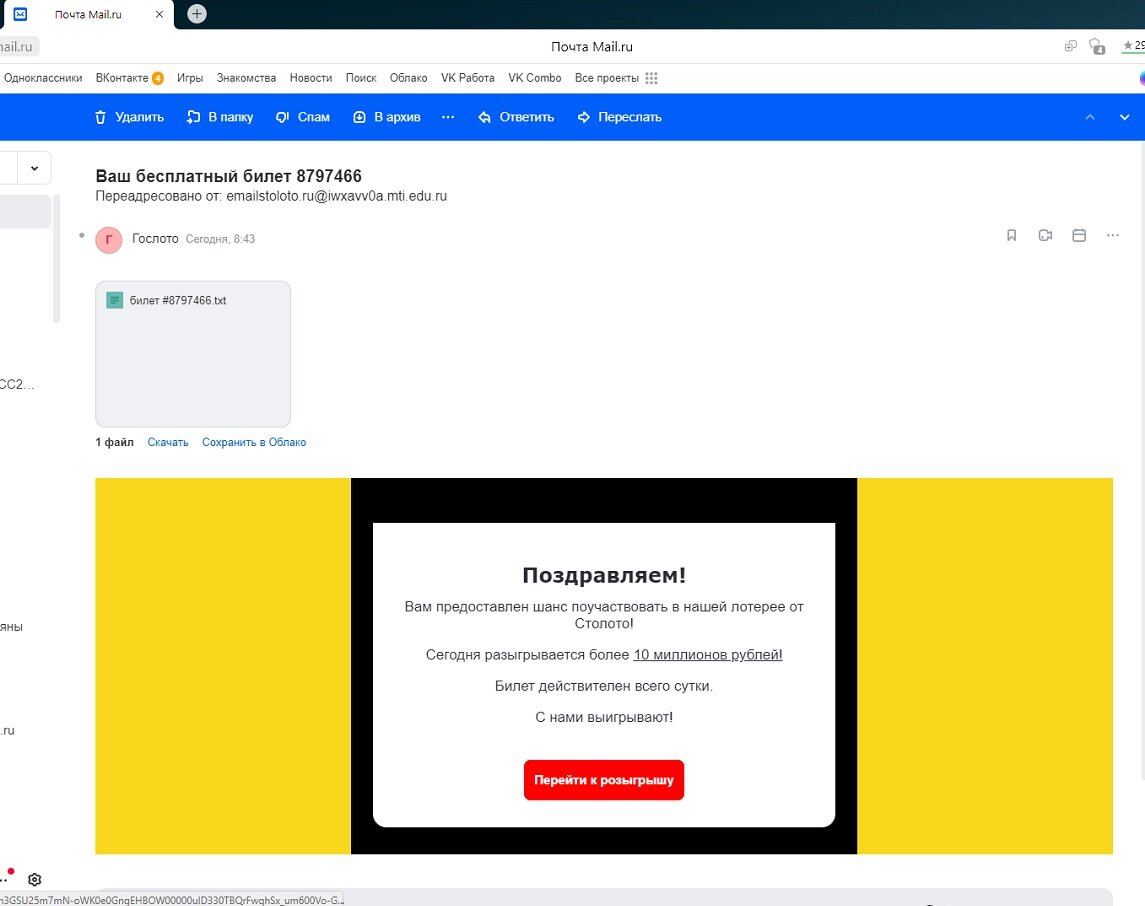 Робин Гуды раздающие деньги тем кому их не хватает ,трудятся не покладая рук.Вот их руки добрались и до меня.Судя по первоначальному заявлению,они просто хотят о счастливить меня не бывалой суммой денег. Но почему то ,вместо того что бы отдать её сразу мне ,они предлагают пройти длинную цепочку до получения этих денег. Представляете мгновенный розыгрыш.Ох как мне нужны деньги,может быть в этот раз мне в жизни повезёт? Да,да,мой билет зарегистрирован.УРА! И вот начался розыгрыш,не уж то мне повезёт.А не обманут.Да нет в шапке и официальное название-Всероссийская официальная лотерея и Русское лото. И подвал солидный,ну не могут же люди получившие лицензию в наглую врать.Сколько я покупал на почте этих лотерейных билетов на почте,что однажды целый месяц их использовал для вытирания жопы в туалете.А здесь явно прогресс,бумажки уже не используют,одно слово 21 век. Нет сегодня точно мой день! Меня поздравляют,сумма выигрыша конечно не та на что я надеялся,но всё же.Даже предлагают связаться