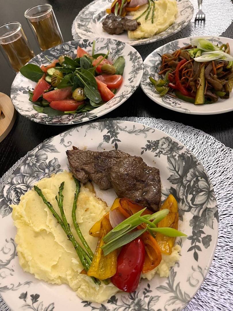Мясо с овощами на гарнир пюре!😋😋😋 Ингредиенты: Говядина , Болгарский перец , Лук, Картофель , Сливочное масло , Молоко , Соль, соевый соус, спаржа , оливковое масло Способ приготовления: Порезать мясо на стейки 1 см, отбить молотком, намазать перцем, соевым соусом и сушеным кориандром, убрать в холодильник ! Картофель нарезать пластинками и отварить, давить давилкой, превратить в пюре, добавить сливочное масло и молоко ! Болгарский перец и лук нарезать крупными квадратиками, обжарить на оливковом масле и добавить немного соевого соуса и чеснока, я добавила туда свежей спаржи. Наше замаринованное мясо вытаскиваем с холодильника и обжариваем на оливковом масле по минуте с двух сторон ! Подаем к столу ! Приятного аппетита!!
