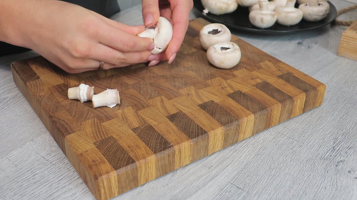 Всем привет! Готовим сегодня шампиньоны с самой простой начинкой, но такой вкусной. Фаршируем шампиньоны фаршем. И скажу вам, что это блюдо универсальное, можно приготовить на закуску, а можно на обед или ужин. Любители шампиньонов оценят этот рецепт. А как я готовлю шампиньоны с фаршем смотрите в видео-рецепте: А еще больше интересных и простых рецептов смотрите на моем канале Ютуб "Так Быстро". Шампиньоны с фаршем: Шампиньоны - 15-20 шт Фарш - 450 г Лук - 1 шт Сыр - по вкусу Соль Специи Шампиньоны 15-20 шт хорошо промываем и обсушиваем. Отделяем у шампиньонов ножку. Ножки шампиньонов мелко нарезаем. Измельчаем 1 луковицу, обжариваем пару минут на сковороде. Добавляем к луку измельченные ножки шампиньонов и жарим до готовности. Далее для начинки нам понадобится 450 г фарша. К фаршу добавляем готовые грибы с луком, солим и добавляем специи. Хорошо перемешиваем. Плотно наполняем шляпки шампиньонов фаршем с горочкой. Перекладываем шампиньоны на противень и сверху посыпаем сыром. С