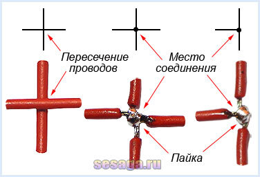 Если взглянуть на принципиальную схему, то в глаза бросается обилие параллельных и пересекающихся прямых линий. Все эти линии обозначают соединительные провода или линии электрической связи, которыми соединяются между собой детали любого электрического устройства. Места соединения, символизирующие электрическое соединение в виде пайки, скрутки, сварки и т.п., изображают зачерненной точкой, а если линии пересекаются без соединения, то в месте их пересечения точка не ставится.
