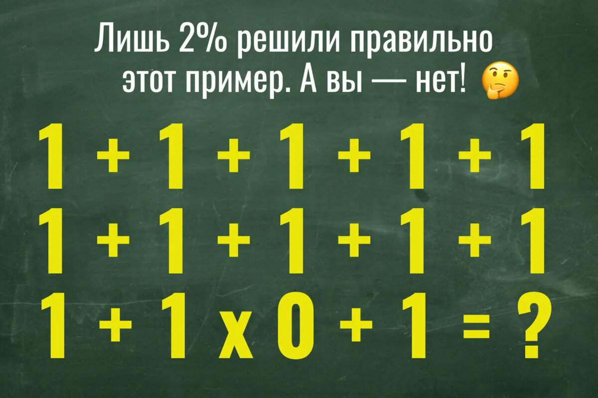 Ученики из Китая выложили в Сеть пример, который почти никто не смог решить правильно с первой попытки. Пост моментально стал вирусным: на первый взгляд в нём всё кажется понятным, но правильный ответ почти никто не дает с первого раза. Предлагаем и вам попытаться самостоятельно одолеть этого монстра из мира арифметики! Докажете, что вы умнее миллионов жителей КНР? Как правильно решить задачу 1+1+1+1+11+1+1+1+11+1x0+1=? Сколько получается в уравнении? Варианты ответы, которые получали ученики из Китая: 1) 10 2) 12 3) 30 А какой ответ получился у вас? Пишите свои варианты в комментариях! #математические задачи #задачи по математике #пример по математике #математика #математика для детей #примеры