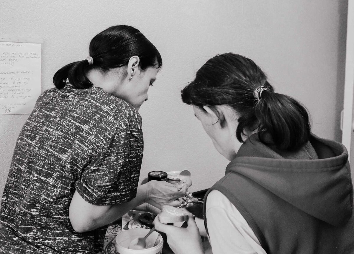 Света и Катя, которые приехали в "Благое дело" из Талицкого пансионата, продолжают осваиваться в квартире сопровождаемого проживания и ремесленных мастерских. С хозяйством и гостеприимностью у Кати и Светы уже всё в порядке: нам предложили кофе и собственноручно приготовленный обед (курица, яичная лапша своего приготовления и испечённые ещё с утра блины). Сейчас специалисты работают над улучшением бытовых навыков девушек, обучают их финансовой грамотности. Четыре рабочих дня Света и Катя работают в керамической мастерской и один — в швейной. Работа им нравится, пока они учатся делать простые кружки и потихоньку осваивают швейное дело. Как девушки сами признались, работа в швейной мастерской даётся им тяжелее, потому что требует внимательности и концентрации, которых им пока не хватает. И Катя, и Света очень трудолюбивы, даже по-хорошему упрямы в достижении своих маленьких целей. Есть и большая цель — научиться полностью самостоятельно жить и поселиться в Усадьбе Аристовых. Сопровождаем