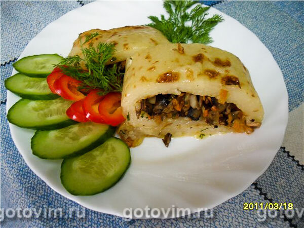 В пост можно приготовить картофель по-особому – в виде рулета с грибной или овощной начинкой. Получится отличная альтернатива мясному блюду. За основу берем картофельное пюре, приготовленное на растительном масле. Начинку готовим из жареных с луком грибов. А вот способов формовки рулета несколько. Опишу только 2 из них. Надеюсь, вам понравится. Постный картофельный рулет с грибами, запеченный в томатном соусе 📜 Для рецепта вам потребуется: Шаг 01 Свежие грибы порезать пластинами. Лук мелко нашинковать. Выложить грибы с луком в сковороду с разогретым растительным масло и обжарить до готовности. Шаг 02 В чашу с холодным картофельным пюре валить растительное масло. Туда же добавить муку. Хорошо перемешать все. Сформировать картофельное тесто. Шаг 03 Застелить рабочую поверхность пищевой пленкой. Раскатать на ней картофельное тесто в толстый пласт. Сверху выложить грибы с луком и свернуть картофельное тесто с начинкой в рулет. Шаг 04 Подготовить форму для выпекания. Смазать дно и стенки м