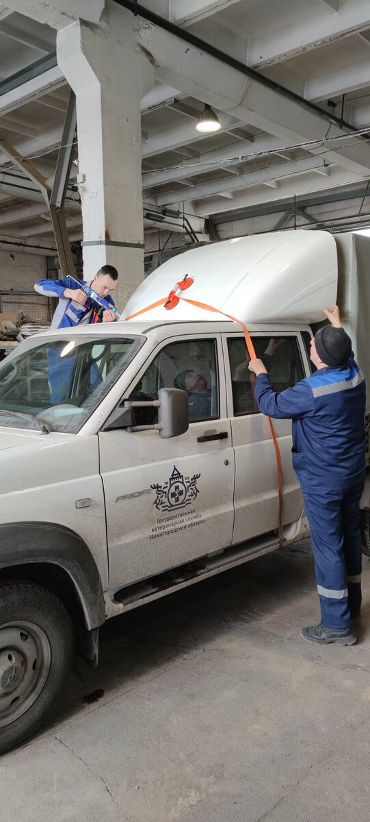 К нам приехал Профи на установку спойлера. Это развозной фургончик УАЗ для ветеринарных нужд города, поэтому постарались поставить спойлер по высшему разряду. Если вы приобретаете у нас спойлер, который клеится на специальный клей-герметик, то мы расскажем как это сделать: Как приклеить обтекатель на крышу?