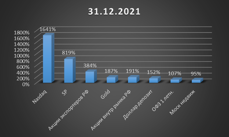 В текущей статье я хочу провести сравнительный анализ различных инструментов инвестирования доступных российскому резиденту. Выборка состоит из: российский рынок акций, представленный портфелем экспортеров и портфелем компаний, ориентированных на внутренний рынок; рынок 1-летних ОФЗ; индексы S&P и NASDAQ; золото, либо ETF на золото; 2 комнатная квартира в спальном районе Москвы под сдачу в аренду; долларовый депозит в банке из ТОП-5. В расчетах применяются следующие допуски: - акции экспортеров – взяты ТОП-15 компаний на Мосбирже по капитализации, доли в портфеле равнозначные, дивиденды включены; - акции компаний внутреннего рынка – ТОП-15, по аналогии с экспортерами; - ОФЗ с постоянным купоном, работа на кривой доходности исключена; - комиссии за покупку продажу акций, ЕТF на золото и индексы не включается в расчет; - доходность от сдачи в аренду недвижимости составляет 4% годовых, стоимость квадратного метра исчисляется на основании данных портала IRN.RU, покупка готового объекта на