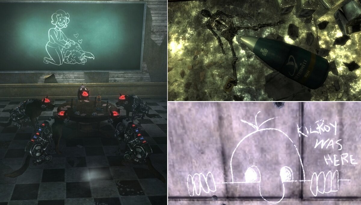 Некоторые считают, что спустя годы после выхода игры они нашли все скрытые жемчужины в Fallout: New Vegas. По правде говоря, Fallout - это игра, в которую нужно сыграть несколько раз, чтобы по-настоящему увидеть все. В этом списке собраны некоторые скрытые пасхалки, секреты и отсылки, которые вы, возможно, еще не заметили. Здесь представлены пасхалки, отсылки и секреты из DLC Old World Blues. 10 Постер к фильму "RALPHIE". В локации Умный Дом в спальне, можно обнаружить схему секьюритрона и постер к фильму "RALPHIE", изображающий робота, сильно напоминающего ЭД-Э. 9 Уменьшенные артиллерийские орудия. Артиллерийские орудия, расположенные в локации X-7A Пробный пуск артиллерии, на самом деле являются уменьшенными версиями артиллерийских орудий из дополнения Operation: Anchorage к Fallout 3. 8 Скелет в неудобном положении. В локации X-7A Пробный пуск артиллерии один из скелетов внутри командной комнаты был сбит грузовиком, который пробил стену центра. Этот скелет лежит в неудобном полож