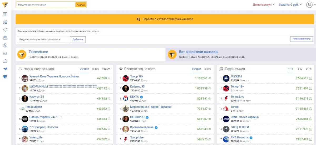 Заходим на сайт telemetr.me, на странице сайта (прилагаю скриншот ниже) нажимаем на значок в виде желто-черного треугольника (логотип компании). Появится меню, в котором нужно выбрать "поиск по каналам" (вторая строчка в всплывающем меню). На открывшейся странице сайта находим слово "категория", выделенное жирным шрифтом. Находим категорию, совпадающей с тематикой вашего канала. В первую очередь принято закупаться у своих конкурентов, только потом можно рассматривать каналы из других категорий. То есть, если ваш канал о политике, нужно искать конкурентов из политической ниши. Закупившись у конкурентов, можно рассматривать каналы на идентичные тематики (авторские блоги) или каналы, где собрана мужская целевая аудитория (автомобили, строительство и ремонт, военные каналы). Присматриваясь к каналу для размещения рекламы, нужно обращать внимание на несколько факторов. ▪️ Откуда набирали трафик; ▪️ Статистика канала; ▪️ Рекламная отдача. Проверяем откуда набирался трафик. Заходим на стати
