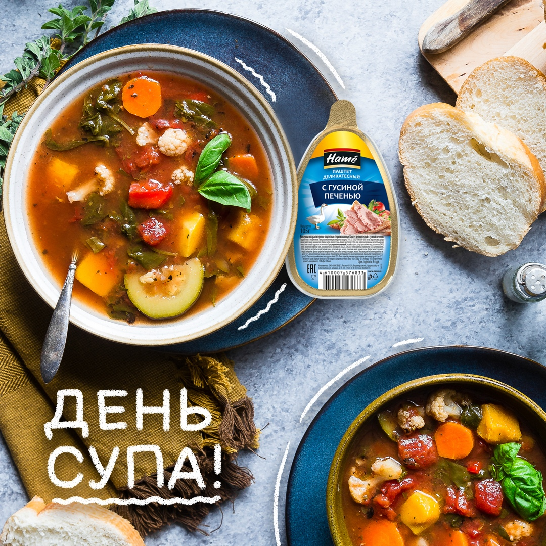 Сегодня праздник — Международный день супа! Предлагаем отметить его тарелкой ароматной чешской похлебки из помидорок 🍲 Попробуйте более утонченный и сытный вариант: добавьте гренки с деликатесным паштетом Hamé c гусиной печенью 🤤 Понадобятся: 🔹 500 г свежих помидоров; 🔹 2 столовые ложки оливкового масла; 🔹 ½ чайные ложки тимьяна или прованских трав; 🔹 500 грамм консервированных помидоров или томатного пюре; 🔹 1 маленькая луковица; 🔹 2 зубчика чеснока; 🔹 ½ чайной ложки соли; 🔹 для гренок: белый хлеб, чеснок, сливочное масло. Разогрейте духовку до 220 градусов. Положите помидоры в миску, залейте их кипятком и дайте постоять минуту. Остудите холодной водой и снимите кожицу. Разрежьте пополам и положите на противень срезом вверх. Полейте оливковым маслом, посолите и посыпьте травами. Запекайте 10 минут. Обжарьте мелко нарезанные лук и чеснок, добавьте печеные помидоры в кастрюлю с водой, туда же — и консервированные. Дайте повариться на очень слабом огне 20 минут. Возьмите погр