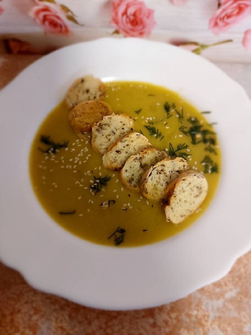 Легкий у приготуванні супчик. Ингредиенты: картоплин, Вода, гарбуза (в мене заморожений), шпинату, борошна, Сіль, спеції, сухий часник(можна свіжий), Сухарики для подачі, пісного майонезу Способ приготовления: Картоплю чищу, ріжу, додаю у кастрюлю з водою, туди ж гарбуз. Варю хвилин 10-15 до м'якості картоплі. Далі блендерую все і знову ставлю на плиту. Додаю шпинат (у мене заморожений подрібнений). Майонез з борошном розмішую з 100 мл. води. Додаю сіль, приправу (типу "10 овочів".), 0.5 ч.л. сухого часнику, 0.5 ч.л. куркуми. Як закипить, все готово. Для сухарів ріжемо багет, або просто хліб кубиками. Беремо 50 мл. олії, 0.5 ч.л. часнику тертого, або сухого, спеції "Прованські трави". Змащуємо наші сухарі і ставимо в духовку на 200° на 12-13хв. Подаємо супчик з сухарями, пеоед подачею можна полити оливковою олією і притрясти кунжутом, або гарбузовими насінням. Можна ще зеленню.