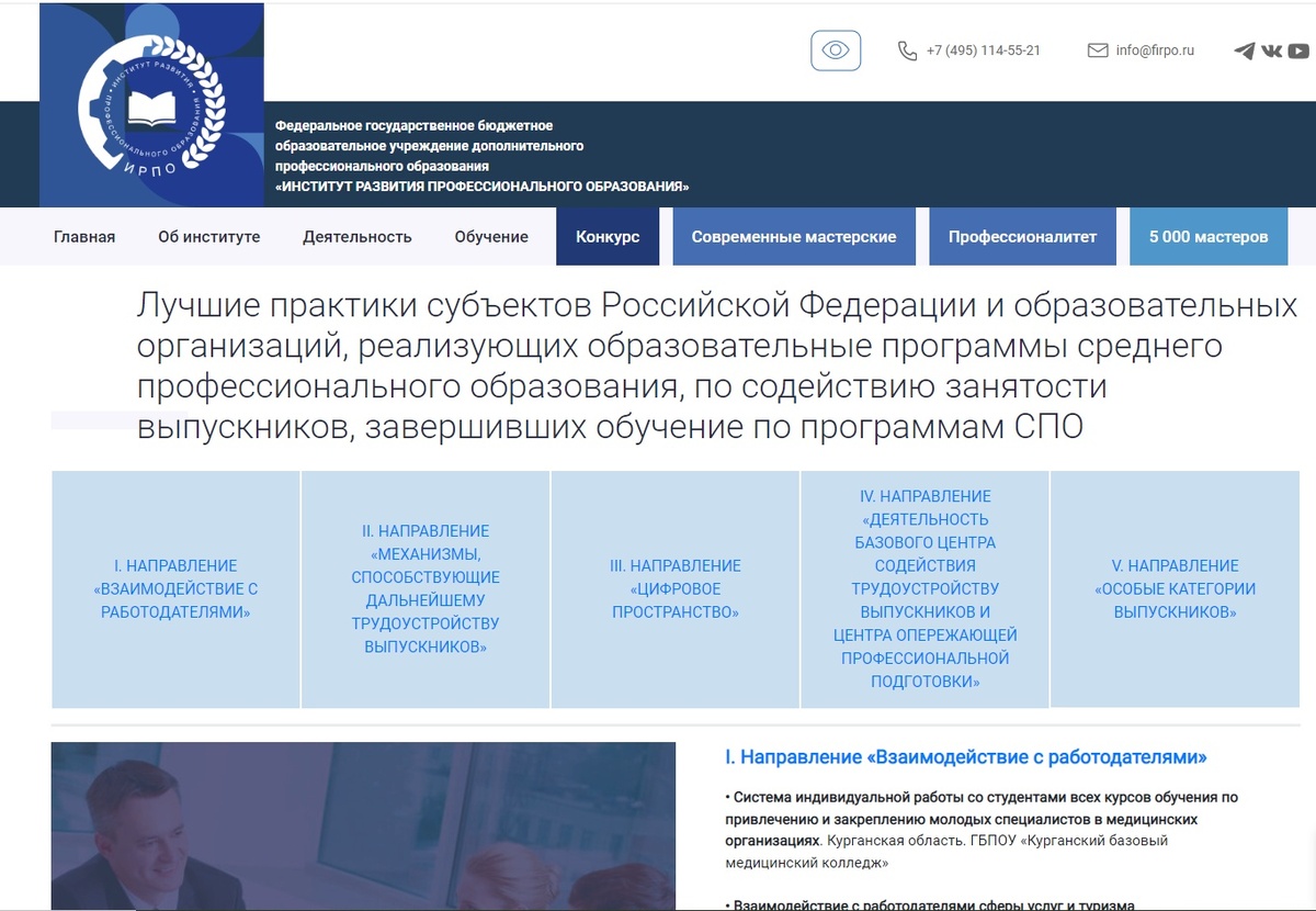 Лучшие практики трудоустройства. Система индивидуальной работы со студентами всех курсов обучения по привлечению и закреплению молодых специалистов в медицинских организациях. Курганская область. ГБПОУ «Курганский базовый медицинский колледж» вошла в Лучшие практики субъектов РФ и образовательных организаций, реализующих образовательные программы СПО. Описание практики размещено на официальном сайте ФГБОУ ДПО Институт развития профессионального образования. https://firpo.ru/luchshie-praktiki-subektov-rossijskoj-federacii-i-obrazovatelnyh-organizacij-realizujushhih-obrazovatelnye-programmy-srednego-professionalnogo-obrazovanija-po-sodejstviju-zanjatosti-vypusknikov-zavers/