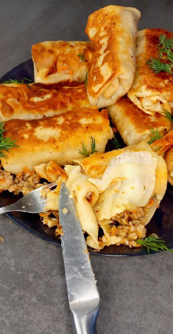 #блины #фаршированныеблины #ужин Тот вариант блинчиков 🥞, которые мой сын готов есть три раза в день семь раз в неделю 🤪😆. Вместо гречки можно брать рис, но в нашем случае гречневая начинка вне всякой конкуренции 🏆🥇. Рекомендую 👇. Ингредиенты: тонких блинчиков, Начинка:, луковичка, морковка, фарша, отваренной гречки, соль, специи, зелень, Для обжарки смесь растительного и сливочного масел Способ приготовления: Лук измельчить и обжарить до прозрачности. Добавить натертую на крупной тёрке морковь. Обжарить до мягкости, добавить фарш. В конце посолить, поперчить. При желании добавить измельченную зелень. Всыпать гречку, перемешать. Начинка готова 👏. Блинчики разложить и распределить начинку (у меня получается примерно по 1,5 ст.л.). Блинчики закрутить и выложить на хорошо разогретую сковородку со смесью растительного и сливочного масел. Обжарить до вкусной корочки. Подать горяченькими. Можно со сметанкой 🤤. Приятного аппетита! 😘