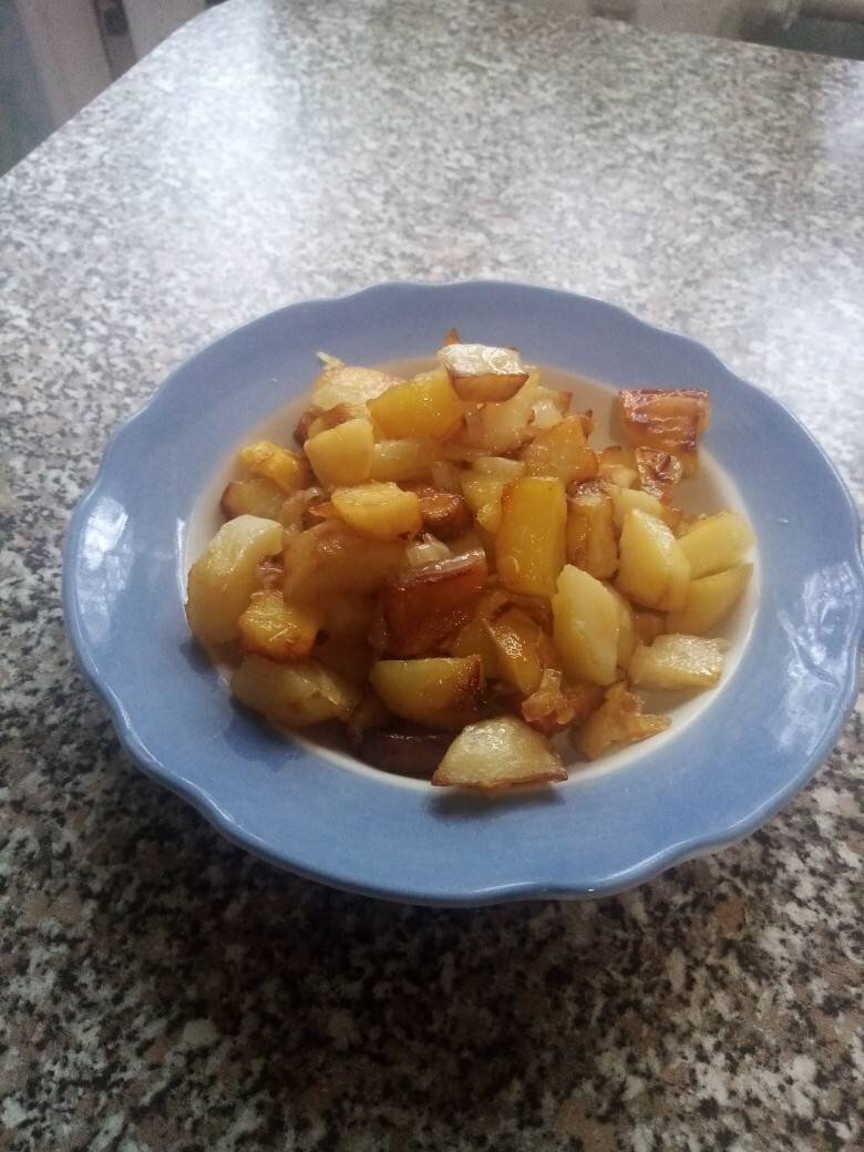 Такой вкусный картофель меня научил готовить муж. Вернее я подсмотрела, как он это делает. Вся фишка в том, что картофель надо резать толстенько (примерно 7 мм толщиной) и часто не перемешивать, начинать жарить на большом огне. Под конец жарки огонь убавить и крышку снять, чтобы не получилась жареная толченка. Итого, перевернуть картофель всего 4 раза. Ингредиенты: свежемороженого сала, картошин среднего размера, луковица большая, соли (по вкусу) Способ приготовления: Сало порезать кусочками и пожарить на сковороде. Затем убрать на тарелочку, оставив жир. Картофель крупно порезать и положить на сковороду. Огонь сделать сильный и обжаривать картофель с одной стороны 4 - 5 минут. Затем перевернуть на другую сторону (перемешать). Оставить ещё на 4 - 5 мин, на большом огне. Пока картофель жарится, режем лук. По истечении времени, картофель посолить по вкусу, положить сверху лук и ещё раз перевернуть. Теперь накрыть крышкой и убавить газ. Через 7 минут снять крышку и ещё раз перевернуть кар