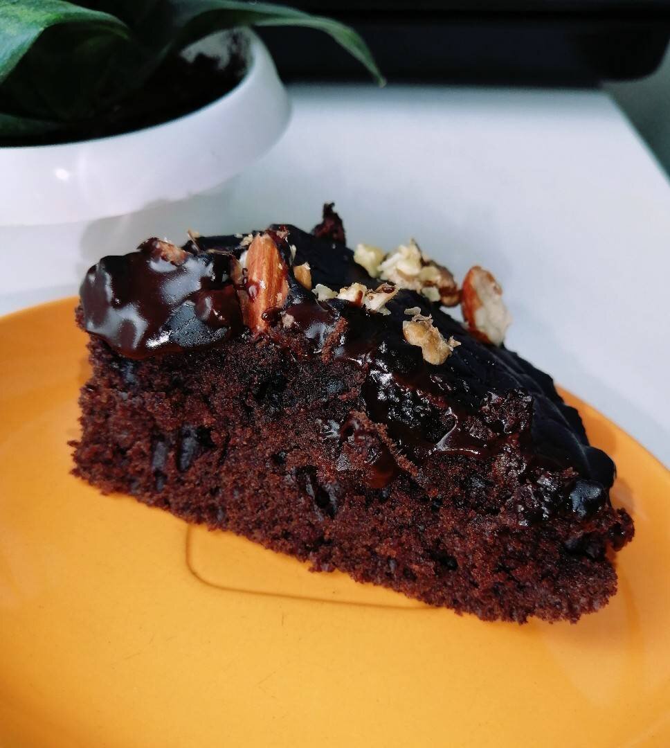 Ингредиенты: муки, какао (у меня алкализованое), сахара, соды, растительного масла, воды, винного уксуса, растворимого кофе, соли, Шоколадная глазурь, воды, какао, Сахарозаменитель (либо 30-40 гр сахара), кукурузного крахмала, растительного масла Способ приготовления: В миску просеять какао, муку и соду. В отдельной ёмкости смешать все оставшиеся ингредиенты до растворения сахара. В два этапа добавить сухие ингредиенты и тщательно перемешать. Переливаем тесто в форму и ставим в предварительно разогретую до 180° духовку на 40-45 мин. Для глазури объединить все ингредиенты и периодически помешивая довести до загустения на небольшом огне. Для украшения я использовала орешки. В начинку так же можно добавить орешки, изюм, кокосовую стружку в общем всё что душе угодно ☺️