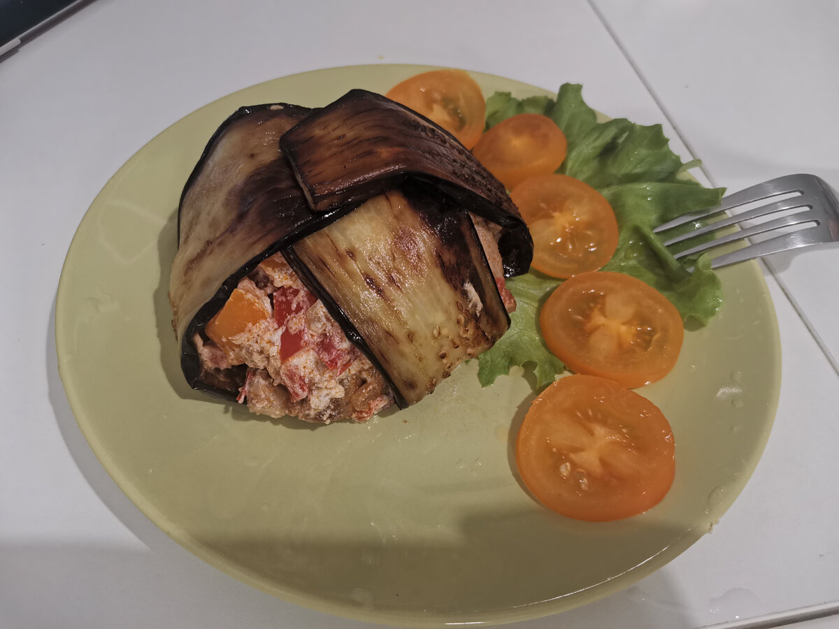 Берем небольшие мисочки, укладываем баклажан так чтобы часть его свисали с каемки мисочки, затем доверху укладываем основным ингридиентом.
