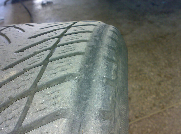 Вот например, очень необычный износ, когда на протекторе активно вырабатывается узкая полоска на самом стыке протектора с боковиной шины. Такой износ получил в среде развальщиков название «ленточный» износ. Речь идёт конечно же не о борозде вытертой в контакте шины с крылом или ещё какой частью автомобиля. Такой износ происходит не при какой то там экстремальной езде на двух колёсах или в дрифте))). Такой износ появляется на шине вдруг просто от обычной езды. Некоторые развальщики объясняют этот износ каким то механическим повреждением шины (но я встречал такой износ на новых шинах, которые не подвергались никаким экстремальным воздействиям). Кто то думает, что такой рисунок износа вызван какими то конкретными неисправностями автомобиля (но я встречал такой износ на новом автомобиле). Кто то думает, что такой износ вызван какими то необычными углами установки колёс (но я встречал такой износ и при