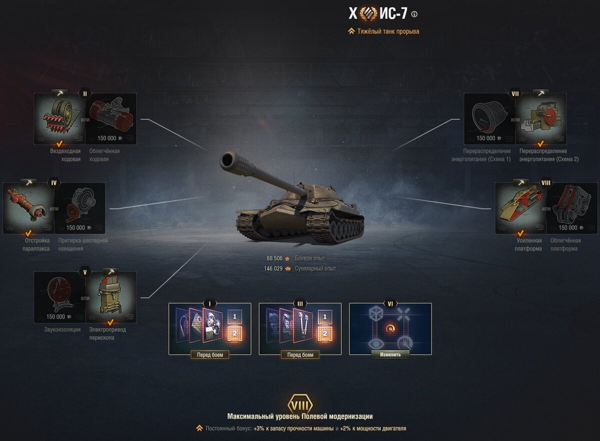 - 4 вилка - схема 2 - жертвуем максималкой в пользу сведения и скорости поворота башни. Максималка у ИС-7 и так запредельная и он ее не набирает, ну только с горы, так что мы только в плюсе.