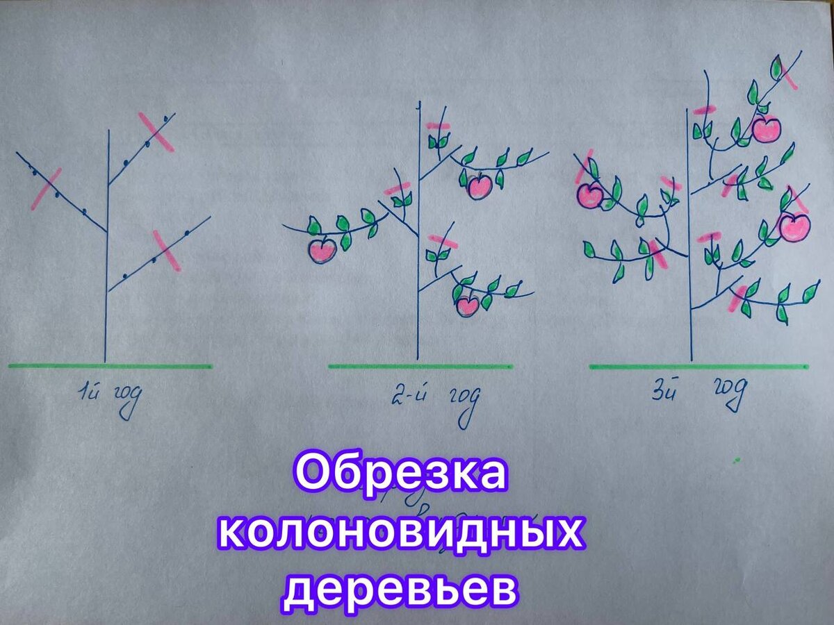 Формируя колоновидные деревья, придерживаемся основных правил: 🍎В год посадки молодого дерева предстоит обрезка веточек на две почки. Благодаря этому побеги укрепятся и впоследствии дадут более здоровую поросль 🍎На след год определяем горизонтально расположенные ветки и обрезаем , если они есть . Плодоносящие оставляем. Длина обрезки индивидуальна, но в среднем 30 см. Вертикальные– расположенные ближе к центральному стволу, оставляем для дальнейшего плодоношения 🍎 На третий год жизни дерева повторяется прошлогодняя обрезка. Разница в том, что дополнительно удаляются побеги, плодоносившие в предыдущий сезон 👌Удаление еще зеленых мелких побегов, растущих со ствола, не нанесет вреда. Наоборот, процедура необходима. Устранение лишней поросли способствует формированию мощного центрального столба и обильному плодоношению 👌Дальнейшая обрезка сводится к оставлению ветвей не старше трех – четырехлетнего возраста. Художник я не ахти, сразу говорю) до Малевича далеко; поэтому не с