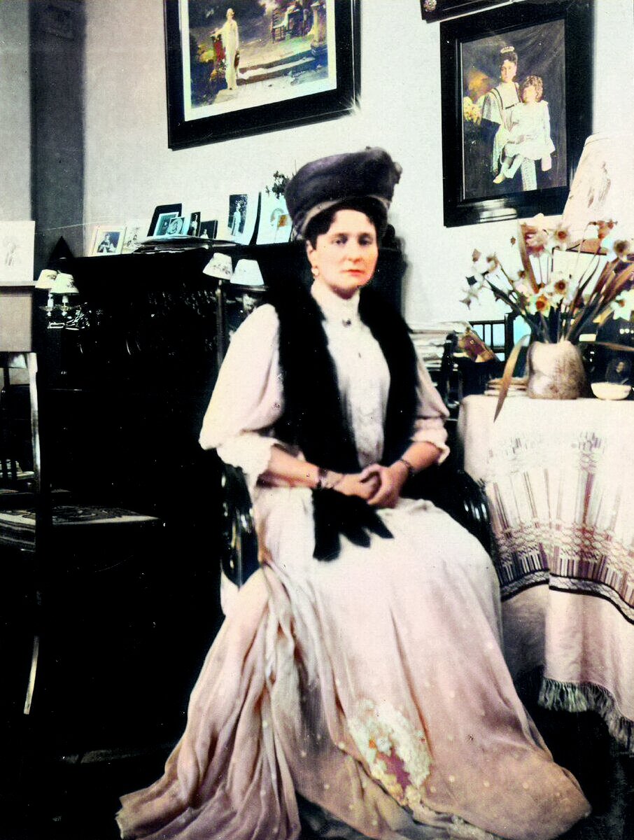 Как то я уже писала статью по этим трем фотографиям, но тогда они были не цветные, а сейчас они снова попались мне, хоть и качество не очень, но все равно я решила их раскрасить. Эти фотографии сделаны в гостиной дома Анны Вырубовой, сначала фрейлины, а потом подруги Императрицы Александры Федоровны. Дело в том, что фрейлина могла занимать свою должность только будучи незамужней, а по выходу замуж своей должности она лишалась. Брак у Анны Вырубовой, к сожалению, был крайне неудачный и быстро распался, и больше никакой должности при дворе она не получила. №1 Итак, на первом фото мы видим Императрицу Александру Федоровну, сидящую рядом со столиком. За её спиной стоит уютное пианино, а на стене висит фотография её с Цесаревичем. №2 Второе фото сделано на том же месте, только со старшей дочерь Императрицы Александры Федоровны - Ольгой. №3 Ну а тут то же лицо в Великой княжной Татьяной. Так как фото сделаны в доме Анны Вырубовой, хочу привести письмо Императрицы к ней, после её ареста в 191