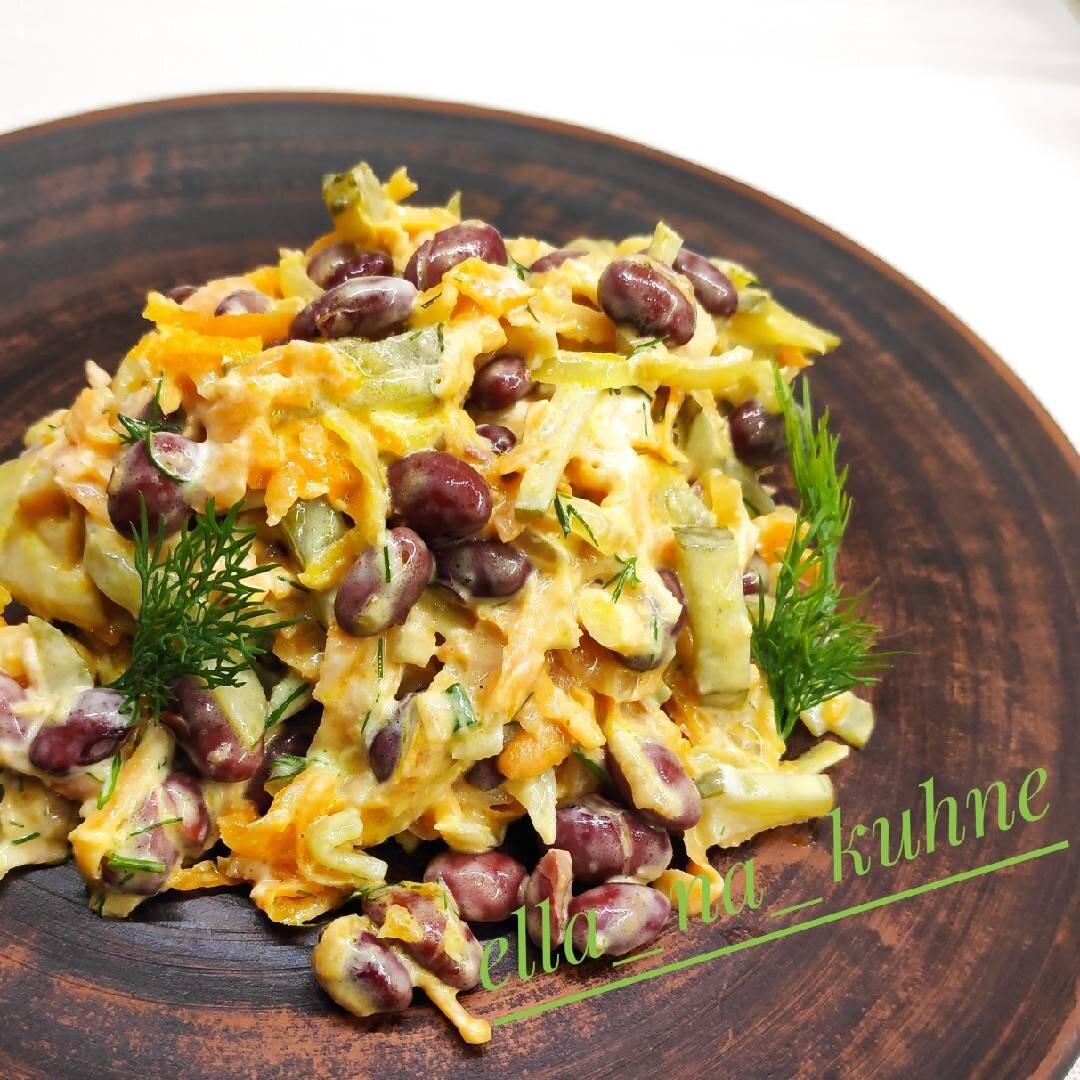 Простой, сытный и доступный по цене салат. За идею спасибо Наталье Воротниковой @Natochka ❤. #пост Ингредиенты: фасоли в собственном соку, морковь, большая луковица, маринованных огурчика, Зелень, Соль, перец , Майонез , Растительное масло Способ приготовления: Морковь натереть, лук нарезать и спассеровать на небольшом количестве растительного масла. Остудить. В миску выложить спассерованные овощи, фасоль и нарезанные соломкой огурцы. По вкусу добавить зелень и смесь молотых перцев (я не солила). Заправить небольшим количеством майонеза (мне хватило на такое количество салата 1 ст л), а можно и не заправлять. Приятного аппетита😍! Если вам по душе мои незатейливые рецепты: подписывайтесь и оставляйте свои фотоотзывы📸!