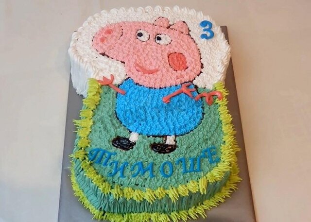 ТОРТ СВИНКА ПЕППА ЙОГУРТОВЫЙ. Яркий, сладкий торт по мотивам мультфильма Свинка Пеппа и Джордж. Оформление из крема. БИСКВИТЫ: Мука - 3 стак. Яйца - 6 шт. Сахар - 3 стак. Растительное масло - 1.5 стак. Молоко- 1.5 стак. Какао-порошок - 40 гр Ванильный сахар - 40 гр ЯГОДНЫЙ МУСС: Ягоды - 200 гр Сахарная пудра - 200 гр Йогурт - 150 гр Сливки - 400 мл Желатин - 15 гр КРЕМ ЗАВАРНОЙ: Яичные белки - 3 шт. Желирующий сахар (1/2) - 300 гр Вода - 150 мл ОФОРМЛЕНИЕ: Пищевой краситель (голубой, розовый, черный, зеленый) по вкусу ПОШАГОВОЕ ПРИГОТОВЛЕНИЕ Время приготовления: 5 ч ШАГ 1: Приготовить бисквиты, дать остыть, разделить каждый вдоль на два части. Приготовить мусс. В форме в которой выпекались бисквиты, собрать торт, пропитывая слои муссом. Оставить торт пропитываться. Тем временем распечатать изображение свинки, обрезать край по условному контуру. Приготовить белковый заварной крем. Если торт стоит на верхней своей части, вырезать из него фигуру по трафарету, пом