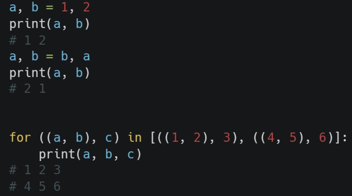Один из популярных трюков в Python – обмен значениями без создания временной переменной. Способ применим для любого числа переменных. В правой части инструкции присваивания последовательностей допускается указывать любые итерируемые объекты. Главное, чтобы число элементов слева равнялось числу элементов справа. Такое присваивание применяется и для сложных вложенных конструкций.
