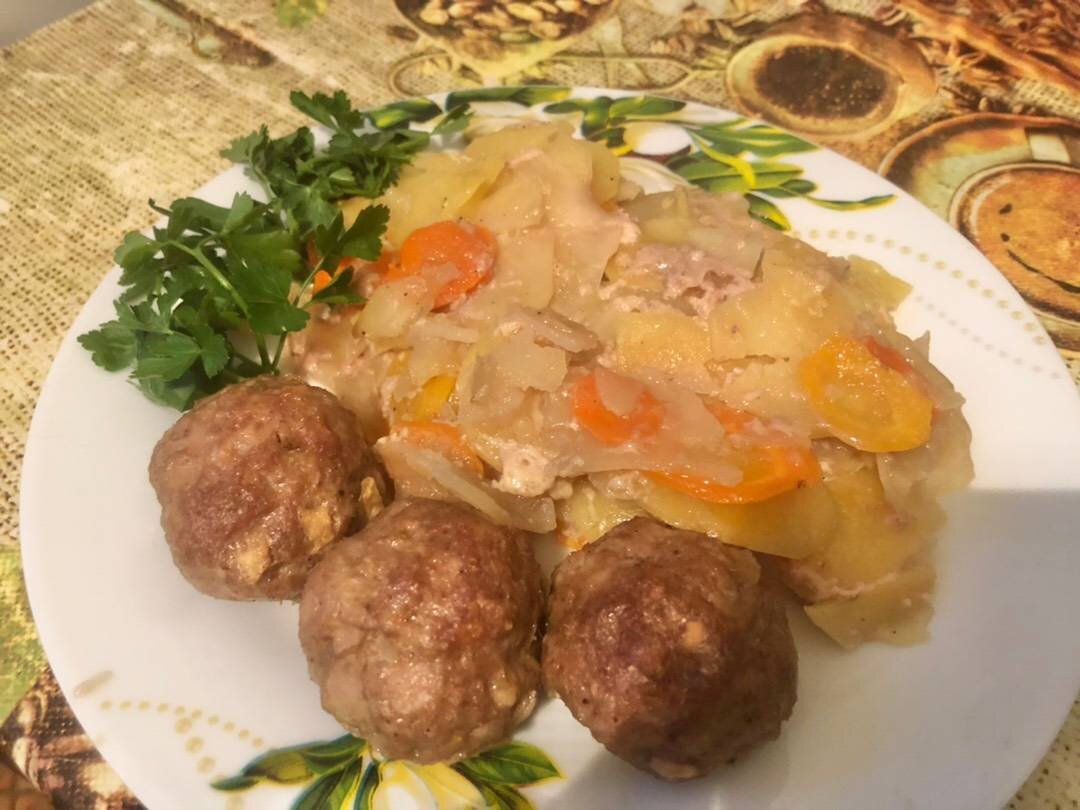 #запеканка #ужин #овощи Ингредиенты: картофель, моркови, луковица, чеснока, фарша, горчицы, панировочных сухарей, лимонной цедры, яйцо, соль,перец, сливок, молока, яичный желток, тертый мускатный орех, зелень Способ приготовления: Картофель и морковь очистить и вымыть. Картофель нарезать кружочками, а морковь - брусочками. Выложить овощи в смазанную жиром форму. Нагреть духовку до 200°. Лук и чеснок очистить и мелко нарезать. Смешать с мясом, горчицей, панировочными сухарями, лимонной цедрой, яйцом, солью и перцем. Из полученного фарша сделать небольшие шарики и выложить их в форму на овощи. Взбить сливки с молоком и яичным желтком, приправить солью, перцем и мускатным орехом. Полить этой массой овощи, накрыть крышкой или алюминиевой фольгой и запекать в духовке 50 мин. Петрушку вымыть, обсушить и украсить готовое блюдо. P.S. Лимонную цедру использовать по вкусу. Можно делать, добавляя и другие овощи: красный перец, цукини.