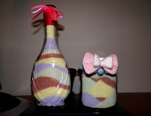 Привет, друзья! Рукодельницы, они такие, всё хочется попробовать чего-то новенького рукодельного сделать своими руками. Однажды в интернете увидела декоративные бутылочки с цветной солью. Такие красивые картинки были и загорелась сделать подобное. Почитала способы окрашивания соли и как потом её правильно сыпать в стеклянную форму и приступила к увлекательному процессу. Вот такие две бутылочки-красотульки с цветным песком у меня получились. Третью отдельно не сфотала. Одна бутылочка из под коньяка, другая от шоколадной пасты. Вымыла и высушила. И занялась солью. Ух и грязищи было потом от моих эксперементов - посуда пачкалась, форма для выпекания подгорела, на балконе кругом соль, так как после запекания соль пришлось разбивать толкушкой и просеивать через сито. Оксана же не ищет лёгких путей (говорят, что соль экстра просто красится цветными мелками), ну и старается использовать то, что есть в запасах. Соль в хозяйстве всегда есть, краска осталась от рисования картин по номерам, шок