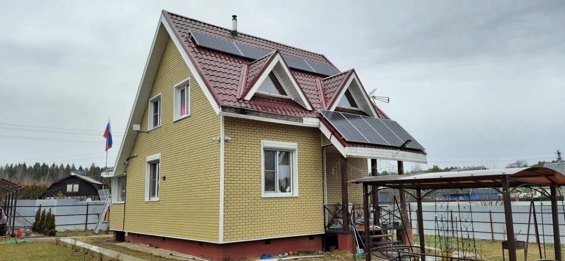 Дом построен на территории СНТ, где электричество очень дорогое и ежемесячные платежи сильно бьют по карману. Для решения этой проблемы нашей компанией была установлена сетевая солнечная станция на 3,3 кВт. Установлены 8 солнечных батарей TopRay 370 Вт Моно HALF-CELL и сетевой инвертор Sofar 3300 ТL-GЗ.
