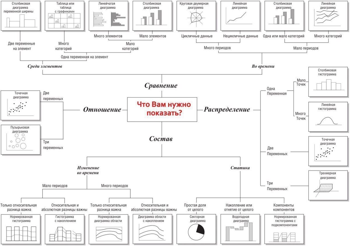 Каждый, кто работает в Excel, когда-либо сталкивался с проблемой выбора подходящего типа графика, который бы визуально лучше всего отражал идеи и замысел автора. В зависимости от типа данных, диаграммы на схеме разделены на 4 основные группы: • Сравнение (характеристики: сравнение величин, много периодов, неповторяющиеся данные); • Распределение (характеристики: распределение величин, обычно две переменных); • Состав (характеристики: структура величин, статика); • Отношение (характеристики: отношение величин, обычно три переменных). Каждая из базовых групп далее делится на множество подгрупп в зависимости от детальных параметров, что позволяет более точно выбрать тип графика. Держите шпаргалку, которая поможет определиться, какую диаграмму выбрать для построения.