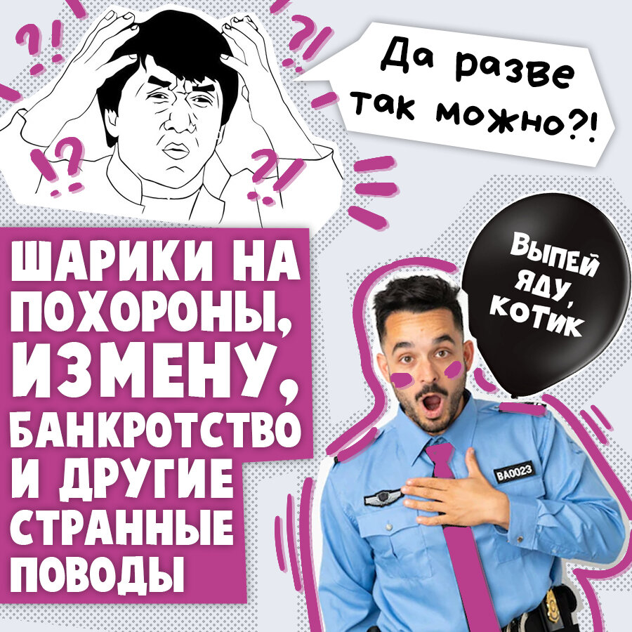Воздушные шары на похороны, в больницу, для признания в измене, как оскорбление участковому и прочее. Тут о самых необычных поводах для заказа воздушных шариков. В группе надувателей воздушных шаров девушка спросила: "Заказали воздушные шары на развод. Это вообще нормально? Кто так уже делал?".