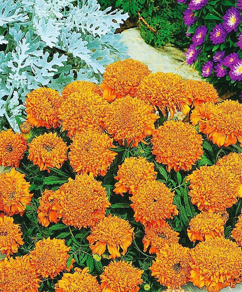 Бархатцы одни из самых ярких однолетних цветов, они бывают с простыми и махровыми цветками различной величины и формы с расцветкой от красно коричневых, оранжевых до однотонных желто-лимонных. Растения образуют устойчивый разветвленный к верху кустик высотой от 20 см для низких бордюр до 40-60 см для цветников. Выращивать бархатцы очень просто, эти растения переносят небольшое похолодание, поэтому посеяв их сразу в грунт, небольшие заморозки растениям не страшны, но тогда они зацветут в середине лета. Бархатцы, выращенные через рассаду, высаживают с первыми раскрывшимися цветками и большим количеством бутонов, цвести они начинают с конца мая. Уход за цветами заключается в прополке, пока растения не разрастутся и не затенят поверхность земли сплошным ковром. Эти цветы засухоустойчивы, хорошо растут даже на бедной почве без дополнительных подкормок, не выносят бархатцы только тень и сырые места. Бархатцы издают неприятный запах, который люди в саду не ощущают, а вот нежелательных