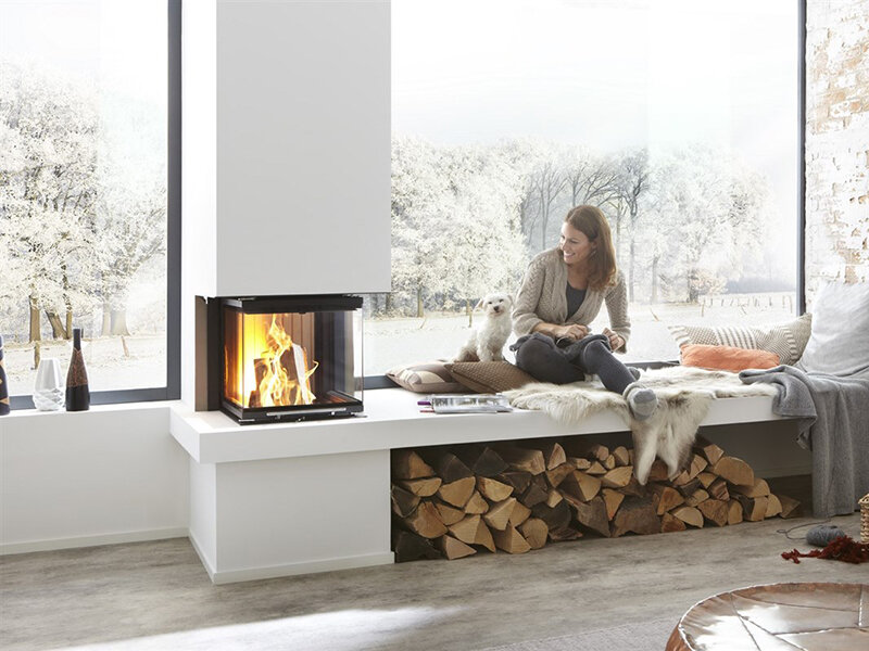 Интерьерные модельеры снова приятно удивляют будущих владельцев каминов интересными оригинальными предложениями. В этом сезоне хитом стала планировка с камином у панорамного окна, направленного на лес, гору или речку. В этом случае эстетика интерьера усиливается сочетанием горящего огня в очаге и колоритными видами природного ландшафта. Камин всё чаще перебирается из тёмных каминных залов на залитые естественным светом террасы. И в этом случае каминная композиция отлично вписываемся в концепцию атмосферного позитивизма. Оформление портала приоконных каминов в большинстве случаев выполняется в светлых оптимистичных тонах.