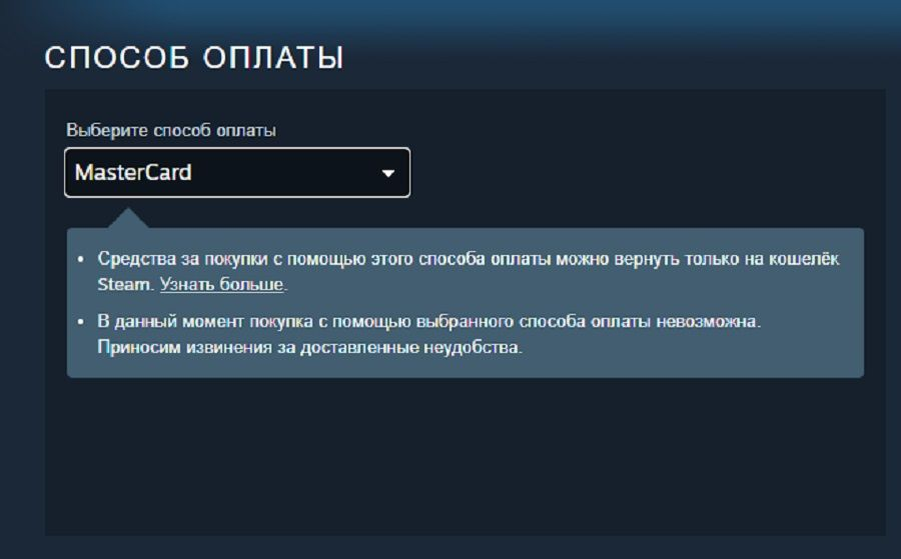 После начала сбоев с оплатой Valve заблокировала возможность платить любыми картами в Steam для пользователей из России. Это касается и Visa, и MasterCard, и «Мир», и «Яндекс.Деньги», и QIWI.