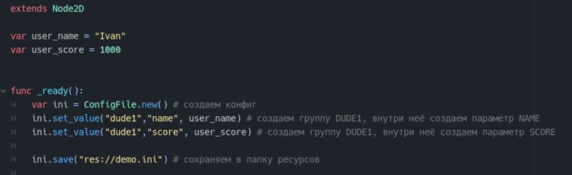 В годо для сохранения файлов конфигурации (INI) создан отдельный класс— ConfigFile(). Напишем простенький код который будет сохранять данные игрока: количество очков, и его имя. В итоге в папке приложения увидим файл demo.ini. При желании файл можно зашифровать. Результат: Загрузка данных из INI файла выглядит следующим образом : Если данных много , то можно загружать это всё через цикл, используя методы get_sections() и get_section_keys() Надеюсь вам был полезен этот материал.