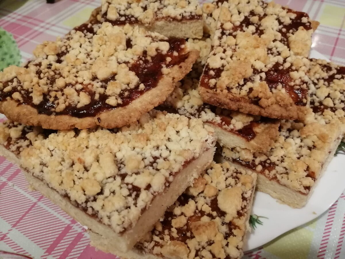 Рецепт: Яйца- 1 шт Сахар- 0,5 стакана Сливочное масло- 180 г Сода- 0,5 чайной ложки Мука- 2,5-3 стакана Джем любой (у меня смородина) Перемешать яйцо с сахаром, добавить растопленное масло. Тщательно перемешать. Погасить соду уксусом и добавить в тесто. Просеять муку и добавляем по немного. Тесто должно получиться мягкое, но не липкое. Делим тесто на 2 части. Одну часть убираем в морозильную камеру на 30 минут. Другую часть раскатываем толщиной примерно 1 см. смазываем обильно джемом. Достаем из холодильника тесто и трем на терке его над раскатанной частью. Выпекаем при 180 градусах до румяного цвета. Готовый корж разрезаем на квадратики. Приятного аппетита))