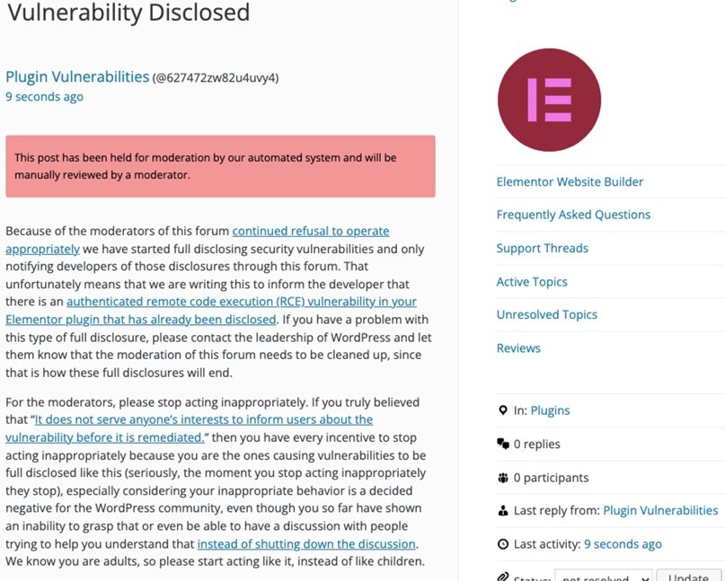 Критическая уязвимость, обнаруженная недавно в популярном плагине Elementor для WordPress, позволяла пользователям загружать произвольные файлы на уязвимые сайты, а затем проводить удаленное выполнение этого кода (RCE). Называются разные цифры потенциально уязвимых WordPress-систем, но счет идет на миллионы сайтов. По данным независимых исследователей из команды Plugin Vulnerabilities, проблема впервые появилась в коде Elementor 3.6.0, выпущенном 22 марта 2022 года. Официальная статистика WordPress гласит, что этот плагин инсталлирован на более чем 5 млн копиях WordPress. По данным исследователей, только около 30% пользователей Elementor обновились до версии 3.6.x. Последняя, безопасная версия плагина, по данным авторов самого плагина, имеет номер версии 3.6.3. Тем не менее независимые исследователи, первыми обнаружившие уязвимость, советуют пока отключить плагин: Основываясь только на том, что мы увидели в ходе нашей очень ограниченной проверки, мы бы рекомендовали не использовать это