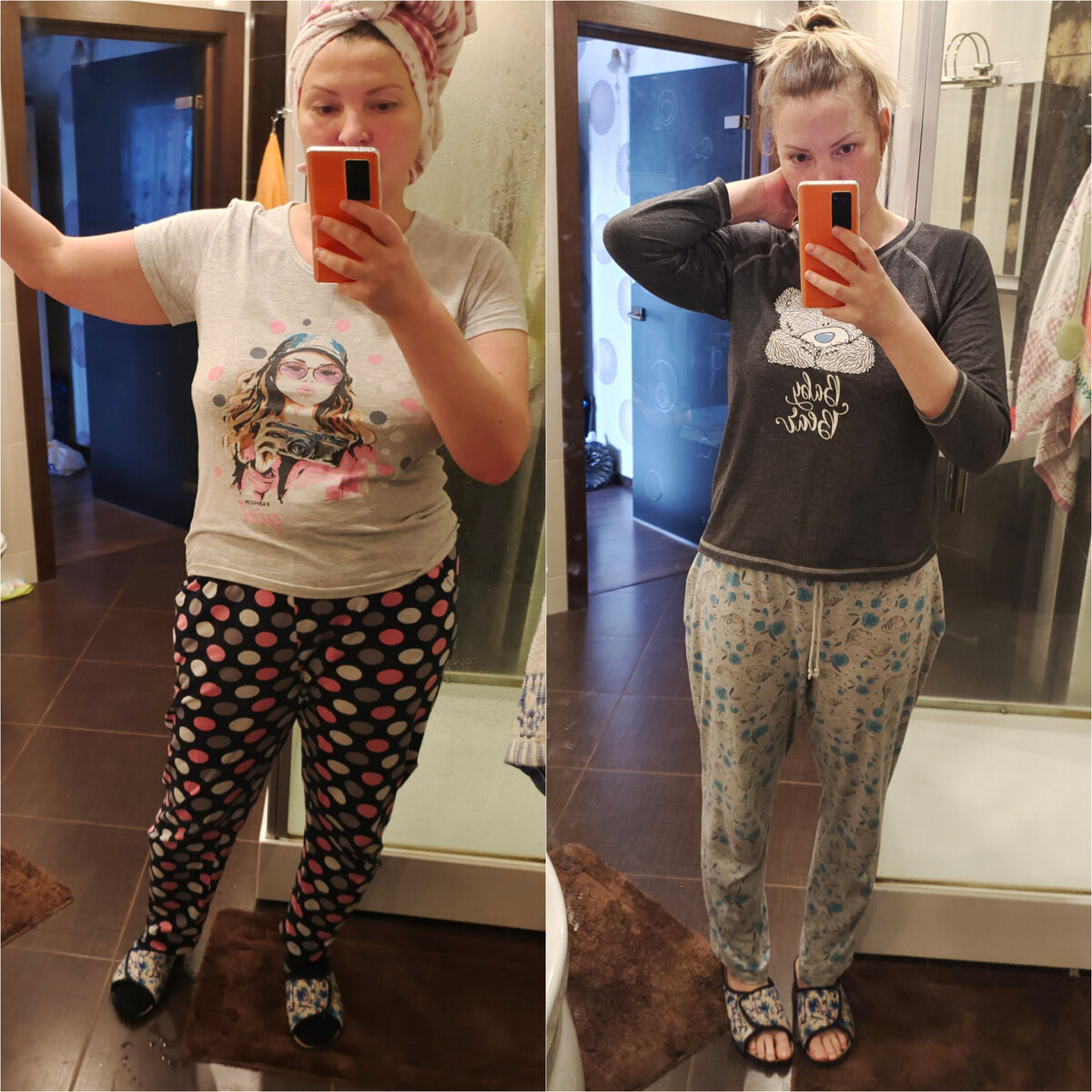 Доброе утро, дорогие читатели! Сегодня вторник, а значит у меня очередной отчётный день. Перемерила всю одежду для нового коллажа, но все либо катастрофически велико, либо мало, поэтому ещё один коллаж в пижаме). За эту неделю мне удалось сбросить 900 гр и... барабанная дробь, я достигла "добеременного" веса! А вот объемы меня не порадовали сегодня: ушел только 1 см с талии, а остальные параметры остались без изменения. К сожалению, цифры в табличку я занесу только когда приедет новый ноут, ну а пока верьте на слово🤗😂. Почему меня не порадовал мой результат? Напоминаю, какой стратегии я придерживаюсь: Вот и получается, что я понервничала из-за налоговой и получила такой вот неидеальный результат. Плюс, мои тренировки уже для меня недостаточны - наступила адаптация к нагрузке. Тем более я сама становлюсь легче, а значит и нагрузка на мышцы становится меньше. Поэтому задача этой недели - довести время тренировок до 20 минут и немного преобразовать их, сделать эффективнее. Пока я тес