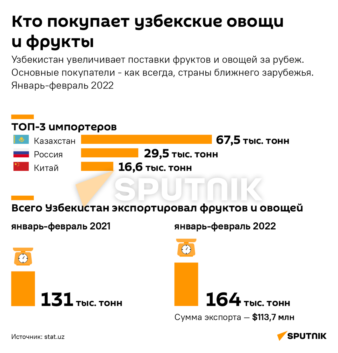 Узбекистан увеличил экспорт овощей и фруктов. Только за два месяца 2022 года зарубежным партнерам поставлено 164 тонны этой продукции. Какие страны закупают больше всего узбекских овощей и фруктов — в инфографике Sputnik.