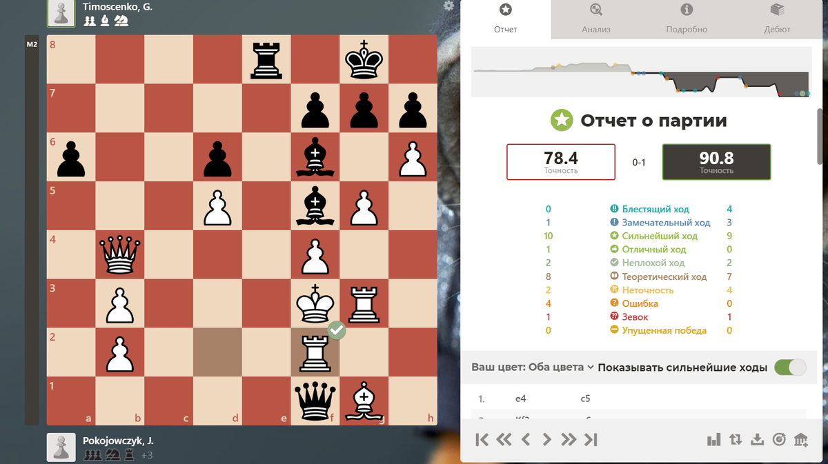 Отличная партия с уверенной победой черных, но главное - блестящая атака, что вам обязана понравиться. белыми играет Покоёвчик, черными - наш Григорий Тимошенко, 1979 год. перед нами финальная позиция из партии, где черные сейчас сделают финальный ход. Найдите его (-м2 на доске, хо д черных) Sicilian Defense: Open, Scheveningen, Keres Attack, 6...Nc6 7.g5 Nd7 8.Be3; Pokojowczyk, J. vs. Timoscenko, G. 0-1; Polanica Zdroj: 1979 Кстати, премного благодарен тем, кто помогает развитию канала и шахмат в стране - вот форма ниже (для богатых и успешных) Итак, приступим. Все задания пронумерованы, справа - то тсамый "!!" ход, что был сделан в партии. Попробуйте его найти самостоятельно, а затем сверьтесь. Ну и плюс потом предлагаю вам партию посмотреть, со стрелками. 1. Ход черных. Как бы Вы сыграли? 2. Опять ход черных. А в этой позиции что? 3. Ход черных снова. Как играем? Смотрите как все было в партии, без доигрывания, но со стрелками анализа