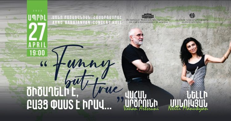 Концерт Ваана Арцруни Песни известного музыканта и композитора Ваана Арцруни прозучат на концерте под названием «Смешно, но реальный факт». Ваан Арцруни — прогрессивный армянский композитор, который, оставаясь верным традициям армянской музыки и сочетая выразительные средства национальной, академической и современной музыки, своим искусством утверждает особый вид культуры и систему ценностей. Арцруни работает во многих музыкальных жанрах — от камерной музыки до рок и фьюжн, от электронной до симфонической и духовной музыки. Концерт состоится 27 апреля, в концертном зале «Арно Бабаджанян». Ваан Арцруни и Нелли Манукян представят программу из песен Арцруни, написанных на стихотворения Комитаса и Размика Давояна. Также в рамках концерта прозвучат инструментальные произведения, написанные для флейты и гитары. Особым гостем мероприятия будет Мадат Аванесов — известный пианист, композитор, аранжировщик и звукорежиссер. Выпускник Ереванской государственной консерватории им. Комитаса по клас