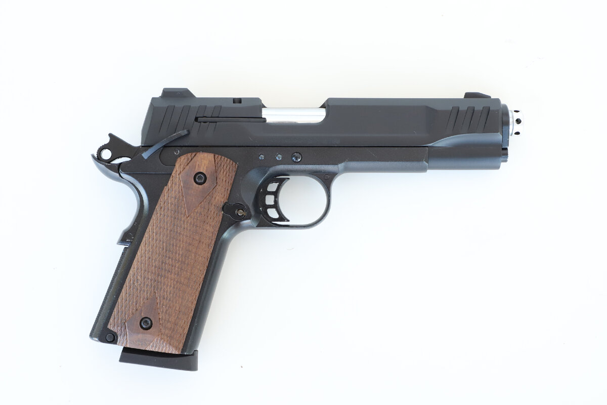 Рамочный предохранитель имеет собственную витую пружину. Разобщитель расположен по центру как у оригинального М1911. Спусковой крючок спортивный скелетонизированный, форма спусковой скобы оставлена классическая овальная, что в сочетании с накладками рукоятки из ореха придает пистолету шарм осовремененной классики. Кстати, рисунок на щечках рукоятки аналогичен самым первым моделям 1911, которые производились до модификации М1911А1.