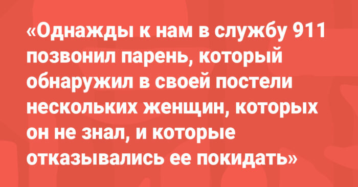 У любого человека, работающего телефонным оператором, наверняка найдётся немало историй о странных людях и смешных случаях, которые произошли после очередного звонка. Это происходит в любом месте, будь то техподдержка местного сотового оператора или же служба спасения. С какими только проблемами не обращаются к ним за помощью! Предлагаем вашему вниманию 10 самых странных и смешных историй, рассказанных операторами 911. Приятного просмотра! Однажды мне (в 911) позвонила женщина и сказала, что её кот застрял на дереве. Я поняла, что она хотела, чтобы приехала машина пожарных с длинными лестницами и спасла кота, и уже собиралась начать объяснять ей, что такое бывает только в кино, но тут она добавила: «..потом мой муж полез за котом и тоже застрял». 2. Обычно мой парень выходил на работу в вечернюю смену, домой возвращался около 2-х ночи. Но на этот раз его смена закончилась на несколько часов позже… Далее диалог парня (П) и 911, куда он позвонил: П: Здравствуйте, я хочу сообщить о лесном