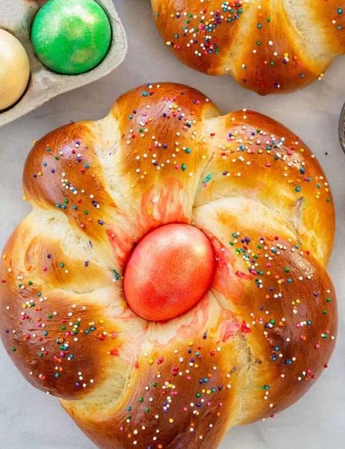 Этот пасхальный кулич с яйцом в центре можно весело украсить всей семьей и он станет отличным подарком для близких! Время приготовления: 2 ч. 50 мин. Ингредиенты: Приготовление: ШАГ 1: В небольшую кастрюлю добавьте молоко и масло. Нагрейте до 49–54ºC размешивая, пока масло не растает. Не позволяйте молоку подниматься выше 54ºC. ШАГ 2: В большой миске смешайте дрожжи, соль и сахар. Добавьте 2 яйца и взбейте. Добавьте подогретую смесь молока и масла. Добавьте 2 стакана муки. ШАГ 3: Миксером с насадкой для теста взбейте на средней скорости до получения однородной массы. Очистите стенки шпателем по мере необходимости. Медленно добавьте оставшиеся 2 стакана муки на средне-низкой скорости, соскабливая со стенок по мере необходимости. Месите, пока тесто не станет крутым и слегка липким, около 12 минут. ШАГ 4: Положите тесто на слегка посыпанную мукой доску и месите вручную в течение 3-4 минут, добавляя еще немного муки, чтобы предотвратить прилипание. Используйте не более ¼ стакана муки.